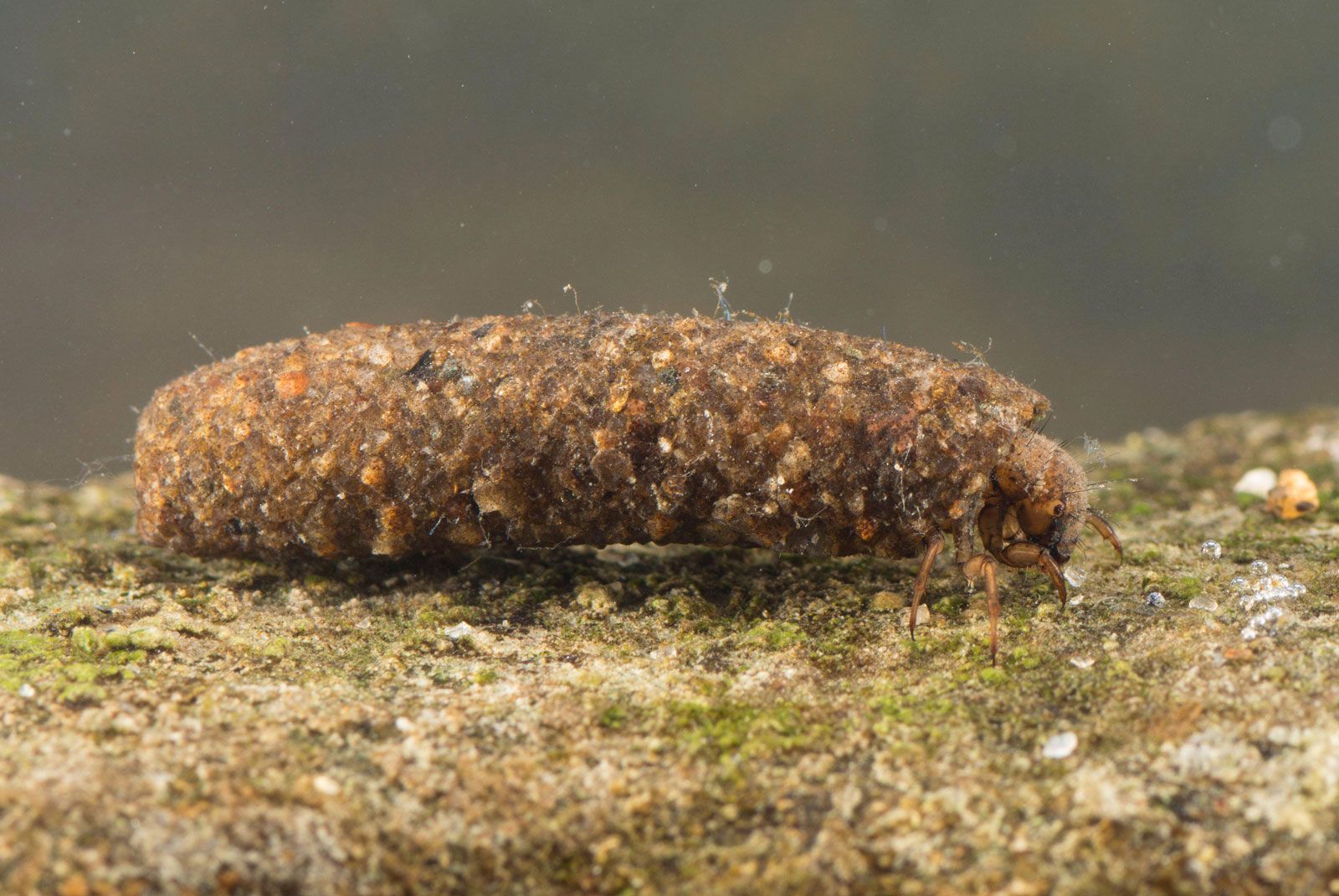 In their larval stage, cased caddisflies (Potamophylax species) are known for their ingenious, pebbly cases that not only serve as protective armor, but also provide stability in aquatic habitats and may aid in obtaining oxygen from the water. The water-dwelling larva protects its soft body with a tubular case spun from silk produced by glands near its mouth. To strengthen this casing, it adds bits of sand, pebbles, or plant debris, creating a portal shelter that grows as the larva does. It seems that cased caddisfly larvae tailor their cases to the speed of the water around them. In swift streams, they use heavier minerals to build cases that keep them anchored against the current. In quiet pools or slow-moving creeks, their cases are lighter and often made of sand or bits of vegetation. Before pupating, the larva attaches the case to a rock or submerged stick and seals both ends. Inside this camouflaged and fortified chamber, it transforms into an adult caddisfly.