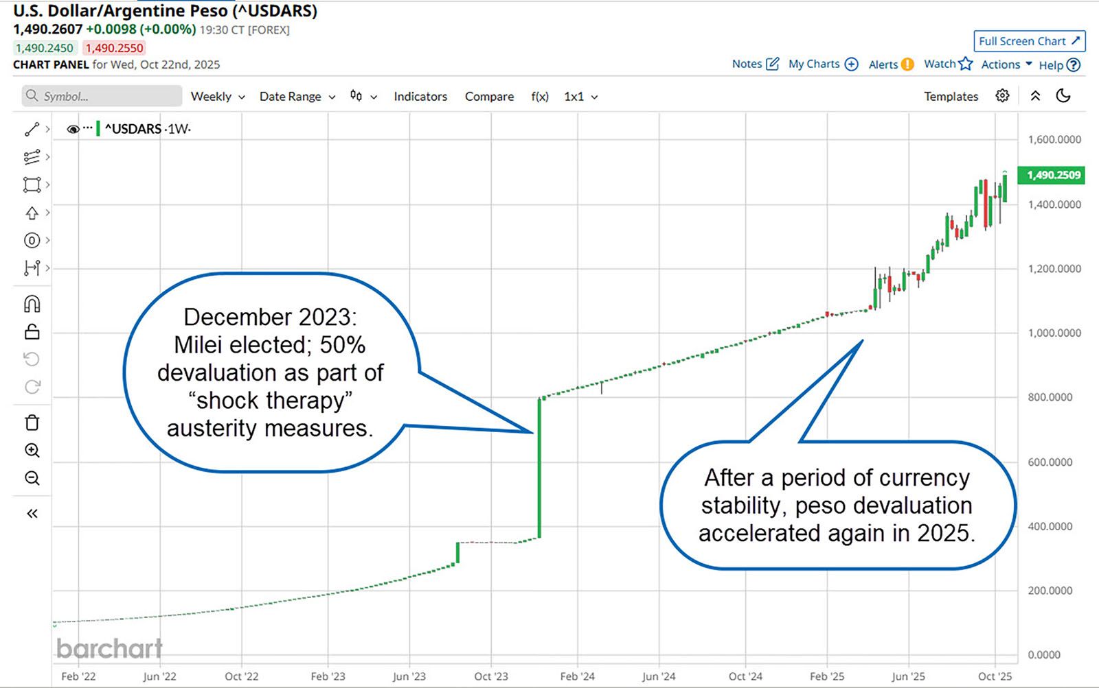 In October 2025 the administration of U.S. Pres. Donald Trump announced the extension of a $40 billion bailout package to Argentina. The U.S. Treasury would provide a $20 billion currency swap to prop up Argentina’s ailing peso (a deal that was finalized on October 20), while an additional $20 billion would be financed by a mix of sovereign wealth funds and private banks. Trump made it clear, however, that continued financial support for Argentina was tied directly to the success of Pres. Javier Milei’s La Libertad Avanza (LLA) party in Argentina’s October 26 legislative elections. Trump stated plainly that “If [Milei] loses, we are not going to be generous with Argentina,” and that “we’re not going to waste our time” with Argentina if LLA isn’t victorious. This provided ample fuel for opposition Peronist politicians who characterized such comments as an extortionate expression of colonialist attitudes.